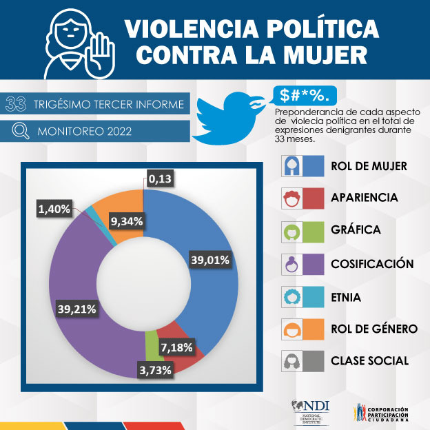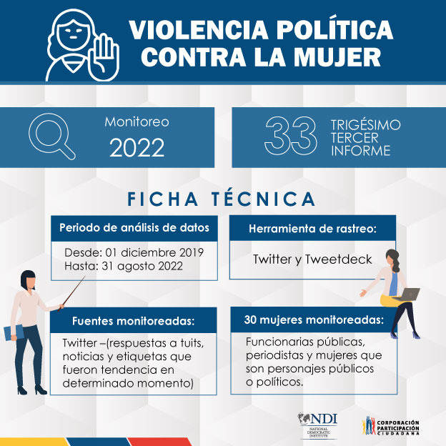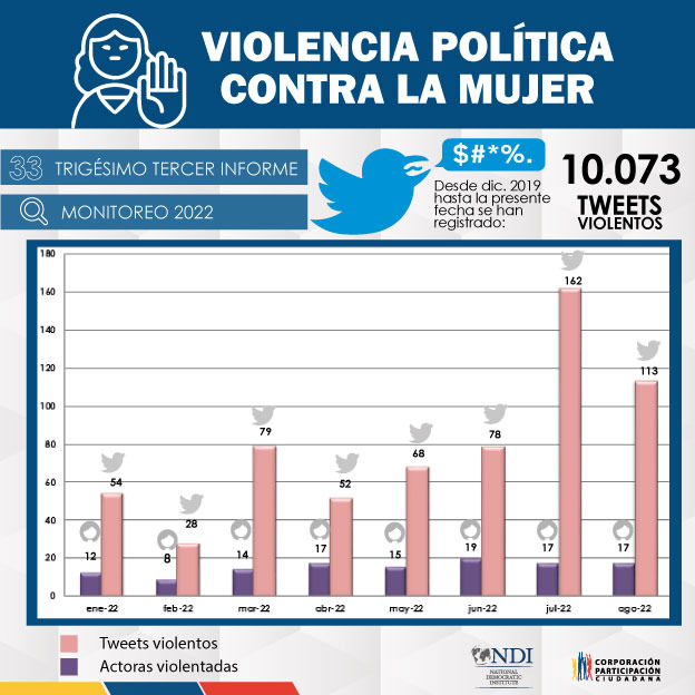 La Corporación Participación Ciudadana presenta el reporte número 33 de monitoreo en la plataforma social Twitter sobre violencia política contra las mujeres políticas y que desempeñan cargos de relevancia, desde el 1 de diciembre de 2019 hasta el 31 de agosto de 2022.