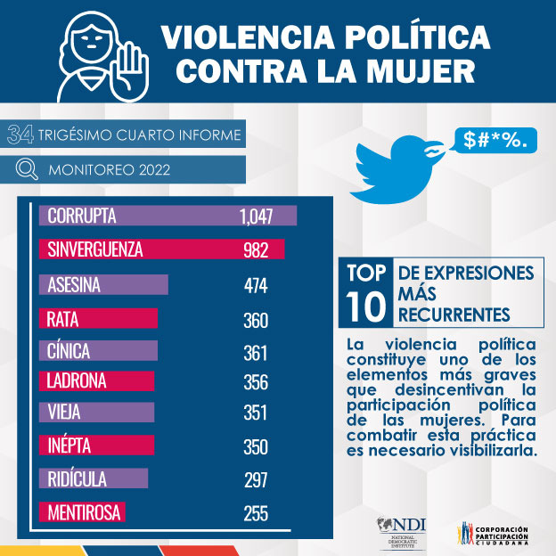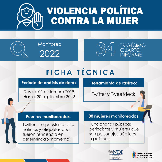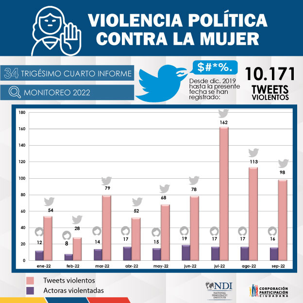 La Corporación Participación Ciudadana presenta el reporte número 34 de monitoreo sobre violencia política contra las mujeres políticas y que desempeñan cargos de relevancia, desde el 1 de diciembre de 2019 hasta el 30 de septiembre de 2022.