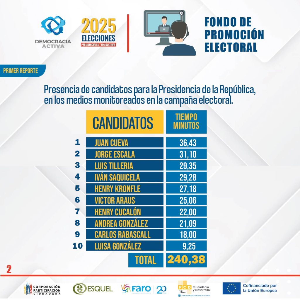 El Centro de Monitoreo de Medios de la Corporación Participación Ciudadana presenta el primer informe de utilización del Fondo de Promoción Electoral por parte de los candidatos presidenciales, durante la primera semana de campaña electoral (del 05 al 12 de enero de 2025), en base al monitoreo en 11 canales de televisión de señal nacional.