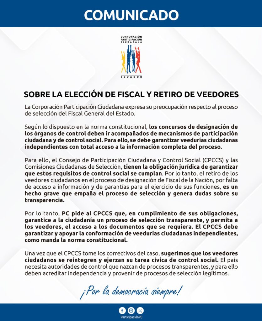 La Corporación Participación Ciudadana expresa su preocupación respecto al proceso de selección del Fiscal General del Estado. Según lo dispuesto en la norma constitucional, los concursos de designación de los órganos de control deben ir acompañados de mecanismos de participación ciudadana y de control social. Para ello, se debe garantizar veedurías ciudadanas independientes con total […]