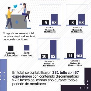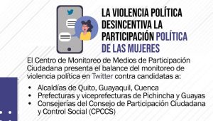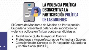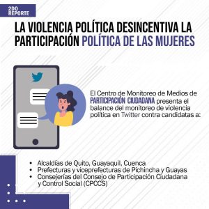 Adicional, se continuará con el monitoreo permanente que la Corporación Participación Ciudadana realiza a la violencia política en Twitter, contra mujeres inmersas en el ámbito político y de relevancia pública, mismo que viene realizándose desde diciembre de 2019.