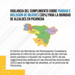 La Corporación Participación Ciudadana, como una organización de la sociedad civil, comprometida con la transparencia, la vigilancia a la gestión pública y la participación ciudadana, acompañará todas las etapas correspondientes al proceso electoral, que se llevará a cabo el próximo 5 de febrero de 2023, en el que se elegirán a las dignidades de prefectos/as y viceprefectos/as; alcaldes / alcaldesas; concejales urbanos y rurales, vocales der las juntas parroquiales rurales y consejeros del Consejo de Participación Ciudadana y Control Social.