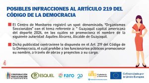 - Vigilancia al cumplimiento del artículo 219 del Código de la Democracia, que prohíbe a las autoridades públicas difundir su nombre en las obras o proyectos.