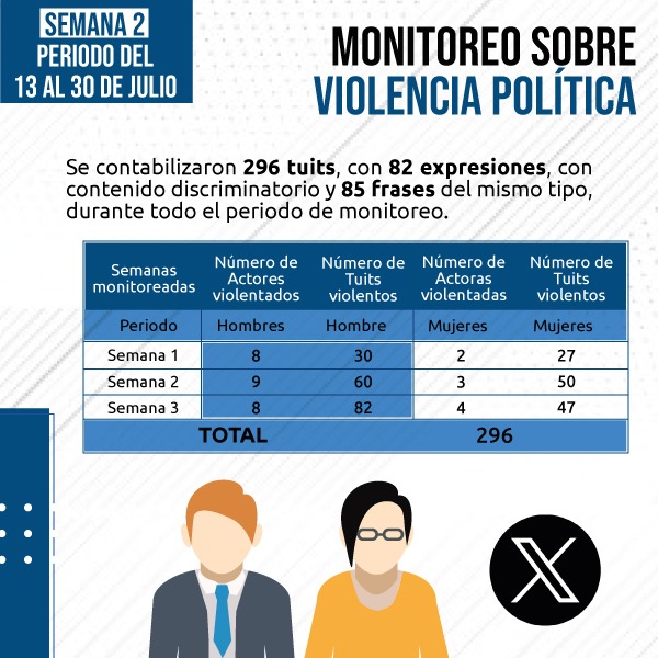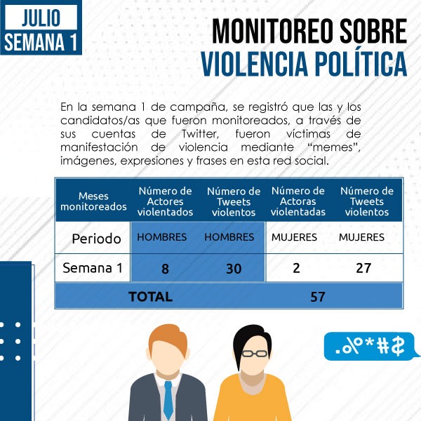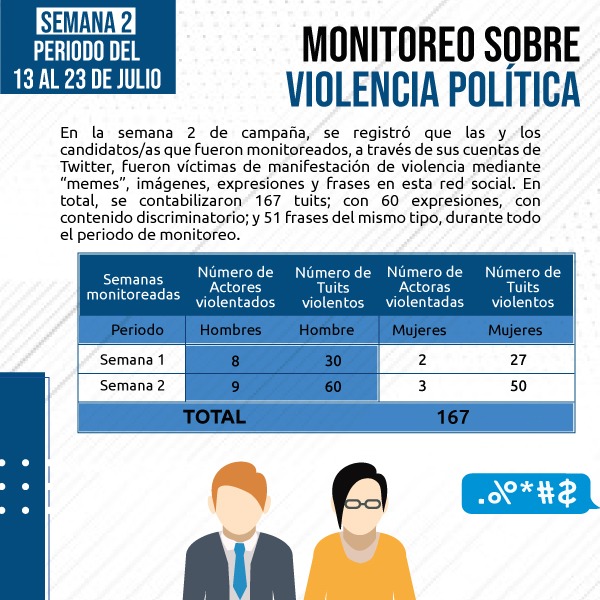 Durante este tiempo, se monitoreó las publicaciones de 25 candidatos/as (mujeres 11; hombres 14), entre ellos, candidatos presidenciales, vicepresidenciales y asambleístas principales. En la semana 2 de campaña, se registró que las y los candidatos/as que fueron monitoreados, a través de sus cuentas de Twitter, fueron víctimas de manifestación de violencia, mediante “memes”, imágenes, expresiones y frases en esta red social.