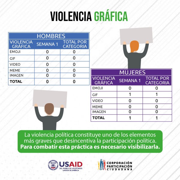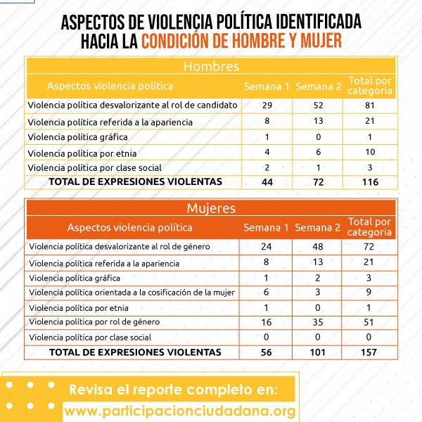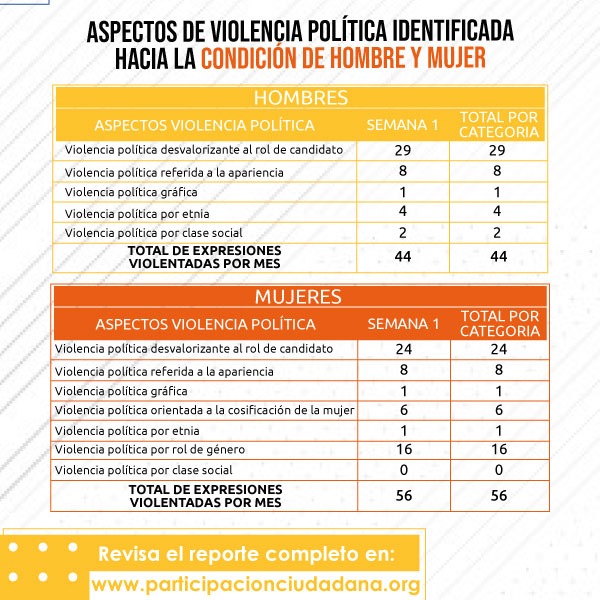 En la semana 1 de campaña, se registró que las y los candidatos/as que fueron monitoreados, a través de sus cuentas de Twitter, fueron víctimas de manifestación de violencia mediante “memes”, imágenes, expresiones y frases en esta red social. En total, se contabilizaron 57 tweets, con 27 expresiones con contenido discriminatorio y 23 frases del mismo tipo durante todo el periodo de monitoreo.