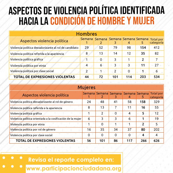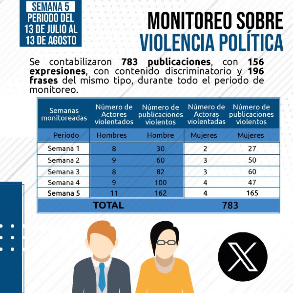 En la semana 5 de campaña, se registró que las y los candidatos/as monitoreados, a través de sus cuentas de Twitter, fueron víctimas de manifestación de violencia, mediante “memes”, imágenes, expresiones y frases en esta red social. En total, se contabilizaron 783 publicaciones, con 156 expresiones con contenido discriminatorio y 196 frases del mismo tipo, durante todo el periodo de monitoreo.