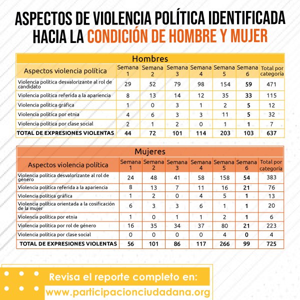 En la semana 6 de campaña, se registró que las y los candidatos/as que fueron monitoreados, a través de sus cuentas de Twitter, fueron víctimas de manifestación de violencia, mediante “memes”, imágenes, expresiones y frases en esta red social.